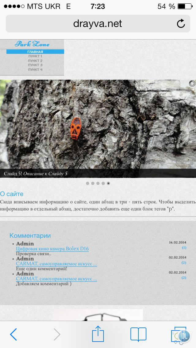 Слайдер расположен в файле шаблона slider.tpl. Тут же вписываем информацию "О сайте", а также выводятся последние комментарии посредством модуля iComm от Пафнутия (файл модуля присутствует в шаблоне и уже адаптирован под шаблон).
