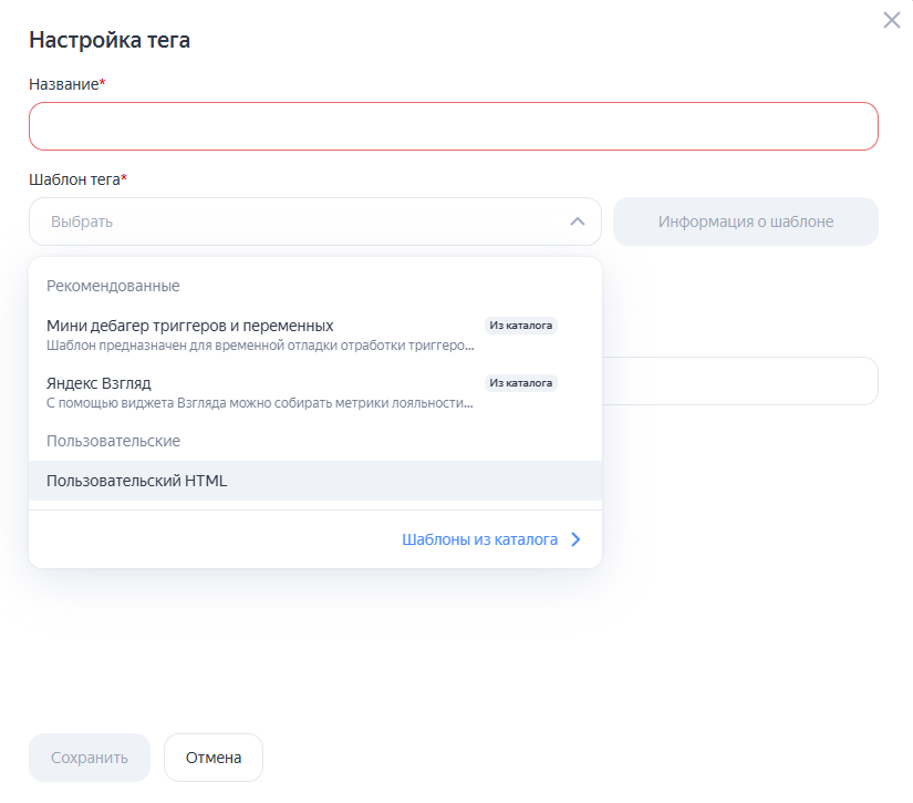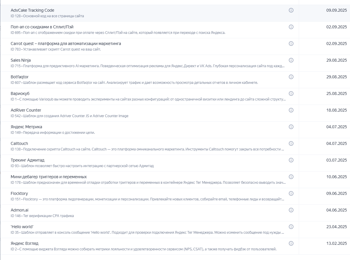 Как и в GTM, на сайт встраивается один код контейнера. Все остальное – управление из интерфейса ЯТМ. Это упрощает жизнь маркетологу: код внедряется один раз, а дальше изменения делаются без участия разработчиков.