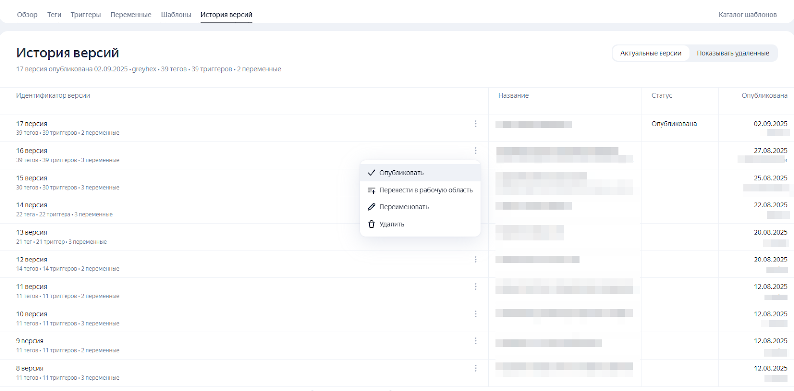 Все изменения можно публиковать по версиям как в ЯТМ, так и в GTM. Это удобно для отката в случае ошибок. Причем на мой вкус в ЯТМ даже удобнее реализовано: