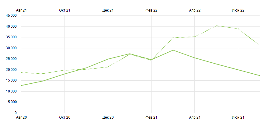 Благодаря доработкам и прибавлению неповторимого контента нам удалось вывести до 70% запросов в топ-10. Также привлечь поисковой трафик: ежели сначала работ по SEO-продвижению (июнь 2021) он сочинял 4000–4300 посещений, то в июне 2022 достигал 9200–9700 визитов из органического трафика.