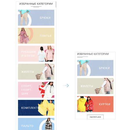 В меню оставили лишь три знаменитые категории продуктов, чтоб уменьшить длину странички, а другие упрятали за клавишей «Глядеть все». Сообразно карте ссылок, самыми знаменитыми категориями являются «Брюки», «Жилеты» и «Куртки» – их мы оставили в зоне видимости.