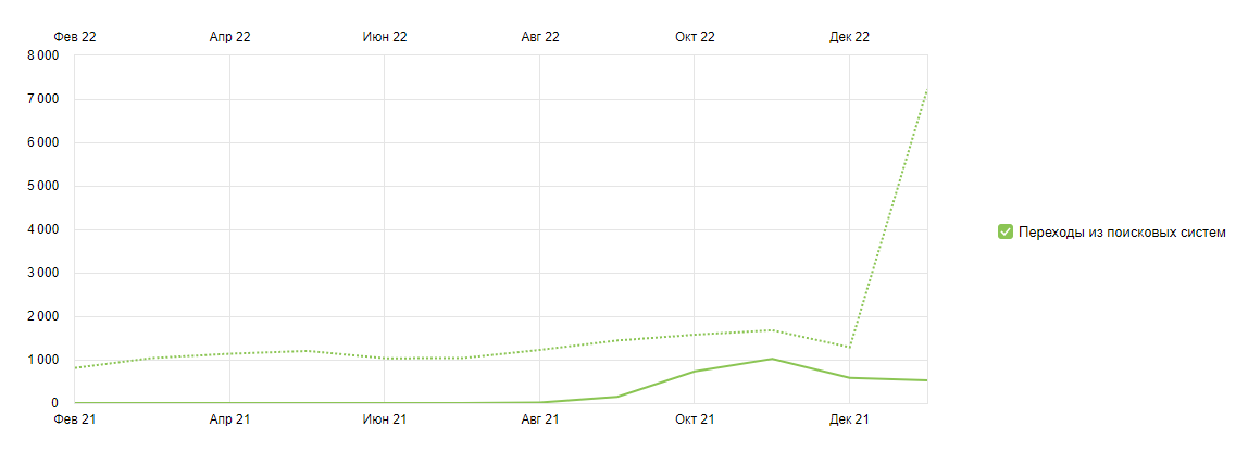 Проделанные работы принесли положительные результаты: мы достигли роста органического трафика с 0 до 7000 гостей сайта за месяц. Также: