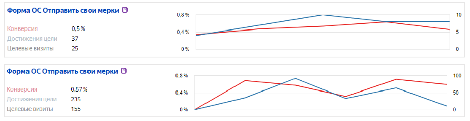 3. Итоговый рост конверсии составил по наполнению и отправке ключевой формы обратной связи – +0,07%. Увеличение общего числа юзеров, достигших данной цели, взошло с 37 до 235 разов.