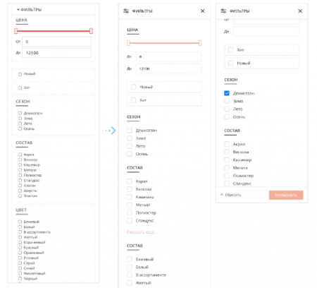 Грамотная реализация фильтрации – один из способов улучшить пользовательский опыт сайта, потому что это поможет юзерам живо отыскать подходящий продукт и совершить покупку. Длинноватые перечни из характеристик фильтрации отвергают возможных клиентов, потому их стоит скрыть за клавишей «Показать еще». Так перечень будет смотреться компактнее. Вприбавок мы закрепили верхний блок с заголовками и закрытием при скролле, также при выборе какого-нибудь параметра закрепили снизу блок с применением/сбрасыванием фильтра.