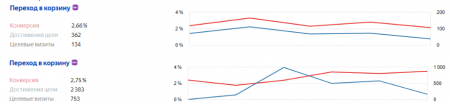 Рост конверсии по цели «переход в корзину» составил 0,09%, увеличение общего числа юзеров, достигших данной цели возросло с 362 до 2383 разов.