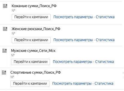 У клиента, который реализует кожаные сумки, рюкзаки, ранцы, барсетки и т. п., вначале были сделаны РК под каждую категорию с подходящей семантикой, как это представлено ниже.