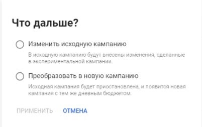 Опосля раскроется окно, в каком можнож применить конфигурации в работающей начальной кампании либо провести А/B-тест. Избираем «Провести эксперимент» и давим клавишу «Применить».